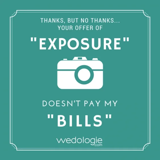 If all you want is exposure then that's good, but think about those who want to progress and earn some money with their passion or those that aim to buy new equipment with their earnings, or those who, for them, photography is a full-time job and they have a family to feed. What is your exposure costing everyone else?